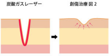 まず炭酸ガスレーザーでニキビ跡に穴を開け創傷治癒過程によりニキビ跡を浅くします。